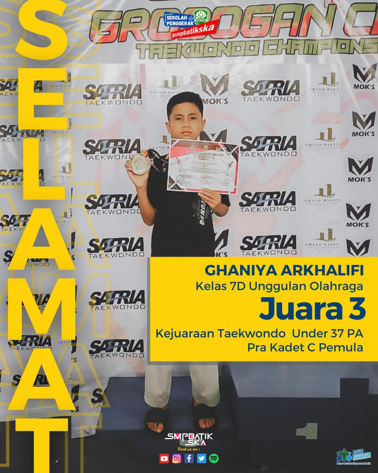 Selamat kepada Ghaniya Arkhalifi Kelas 7D atas prestasinya sebagai Juara 3 dalam Kejuaraan Taekwondo Under 37 PA Pra Kadet C Pemula