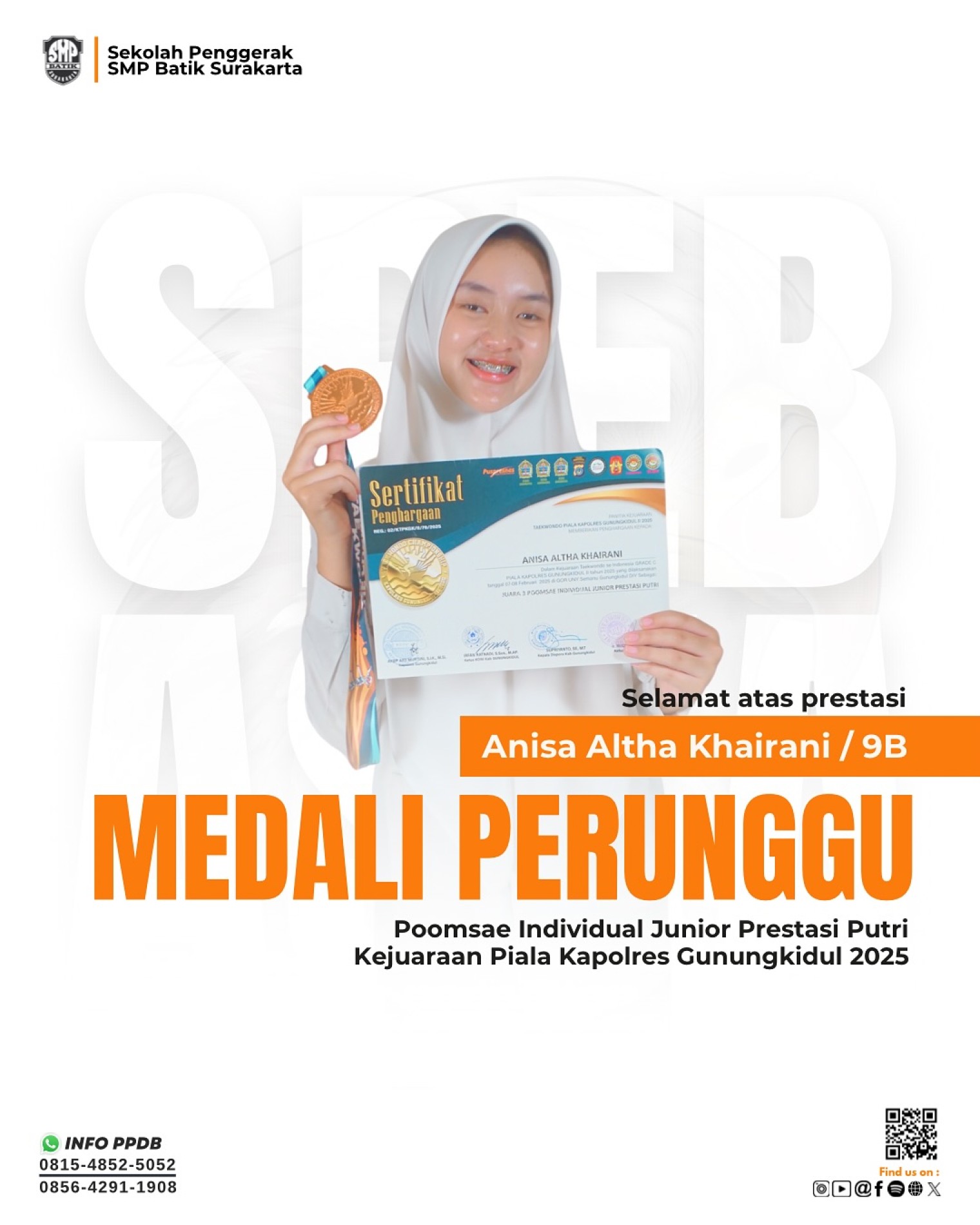 Selamat kepada Anisa Altha Khairani Kelas 9B atas prestasinya sebagai Peraih Medali Perunggu Poomsae Individual Junior Putri dalam Kejuaraan Piala Kapolres Gunungkidul 2025